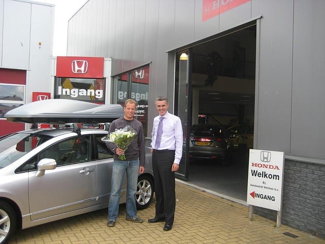 Met de dag worden de Hybrids mooier. Kijk nu toch eens naar de auto van de heer Post. Een alabaster zilveren Hybrid met 16 inch velgen. Prachtig. Eind maart zaten wij, samen met zijn schoonvader die ook Hybrid gaat rijden, aan de tafel bij Welman en het was eigenlijk zo gezellig, dat we met z?n allen vergaten dat het om het aanschaffen van een nieuwe auto ging. Zo moet het ook zijn bij de dealer, lekker gezellig, u kent het wel. ( Of misschien ook niet ! ) Donderdag 19 juni was het dan al zo ver. De Hybrid werd naar buiten gereden, de telefoon aangesloten en de auto trok met de heer Post de wijde wereld in. West Friesland is weer een bijzonder duo rijker.