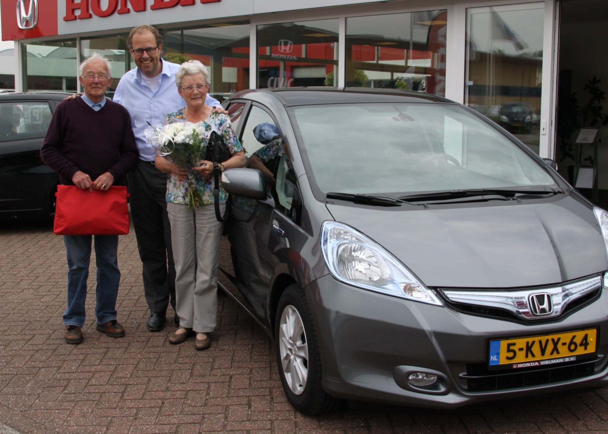 De familie Veenstra heeft al een aantal Honda’s achter hun naam staan. In maart kwamen zij met hun Honda Jazz voor een onderhoudsbeurt, samen met dochter Thea. Een gezellig gesprek aan de koffietafel liep uit op hun verzoek om te laten weten wanneer wij een leuke automaat binnen zouden krijgen. Zo gebeurde het dat we anderhalve week geleden een belletje pleegden om te melden dat er een mooi exemplaar van een jaar oud ging binnen komen. Een Honda Jazz Elegance Hybride. Dit klonk heel aantrekkelijk dus de afspraak om vanuit het mooie Slootdorp weer even naar Heerhugowaard te reizen was gemaakt. De auto beantwoorde in alle opzichten aan hun wensen en ook ons voorstel viel goed. Het besluit liet dan ook niet lang op zich wachten, dit is ‘m!