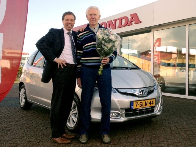 De heer van Leijen rijdt al jaar en dag met een zilveren Honda af ons bedrijf in Heerhugowaard. Ooit begon het in 2001 met een Zilveren Honda Civic 3 deurs, waarna er velen zijn gevolgd. En nu op de onlangs gehouden winterinspectie-dag stond wederom zo’n mooie zilveren, dit keer een Jazz Hybrid automaat binnen onze winterse showroom te pronken. “Zo’n één wil ik en met een automaat, is dat eigenlijk moeilijk?” Wij zullen het u leren heer van Leijen. En het is goed aangeleerd de foto werd namelijk na het lesmoment genomen.