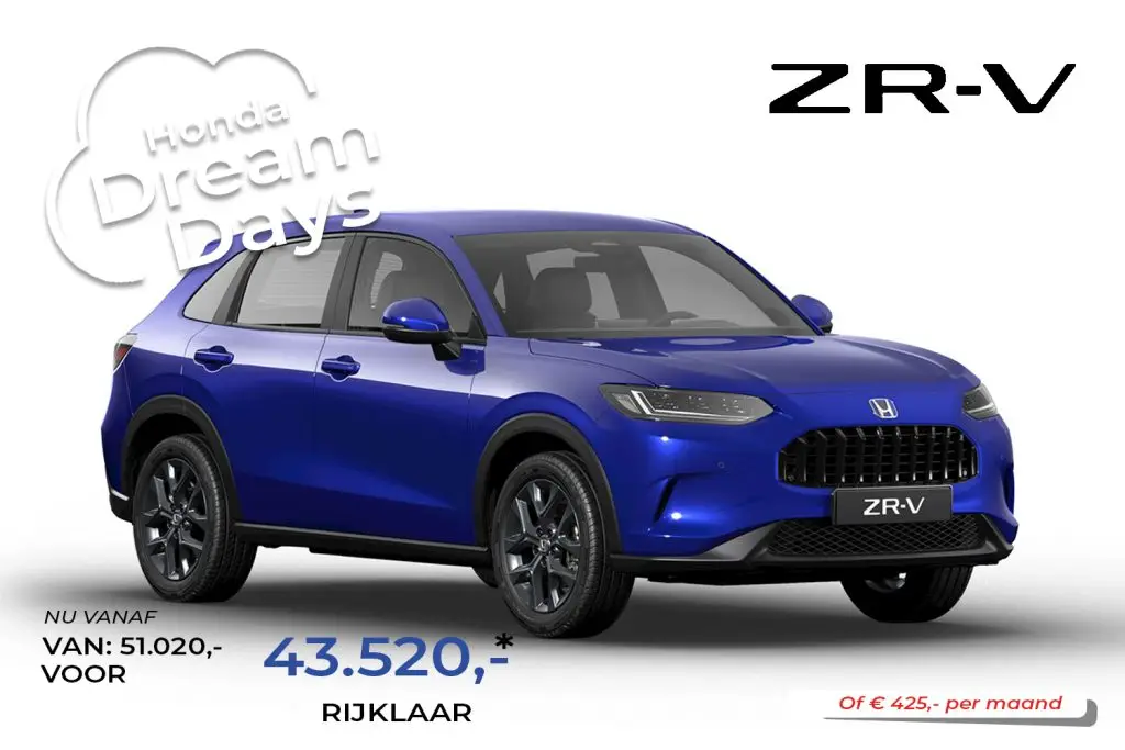 De nieuwe Honda ZR-V is onze middelgrote SUV met een karaktervol voorkomen op de weg. Het chassis is ontworpen om de luchtstroom te maximaliseren. Geïntegreerde koplampen en een groot radiatorrooster maken zijn verfijnde look compleet, terwijl de aerodynamische achterspoiler en dubbele uitlaten voor een sportief randje zorgen.